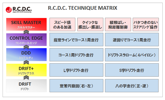 TECHNIQUE MATRIX(テクニックマトリクス)とは、R.C.D.C.が、R.C.D.C.の企業会員とタッグを組んで今年より開始する、ドリフトラジコンのテクニックレベルを検定し認定する制度です。 TECHNIQUE MATRIXには、ドリフトテクニックに合わせてチャレンジ出来る5つのステップがあります。 全てのドライバーは、「DRIFT」レベルから順に、1段階ずつ受験することができます(レベルをスキップして受験することはできません)。検定に合格すると、R.C.D.C.より、証明書となるライセンスカードが発行されます。 |